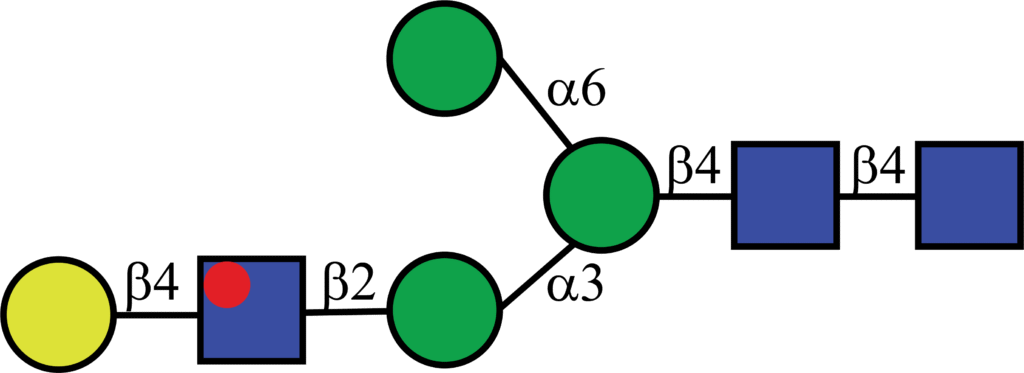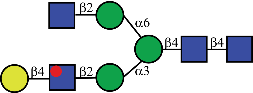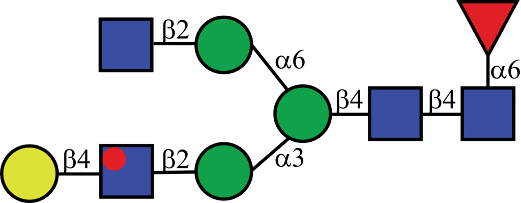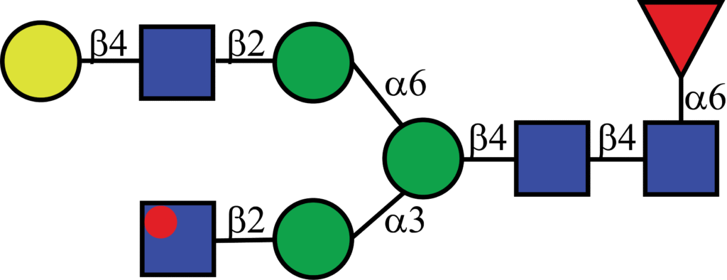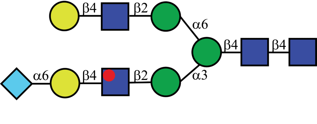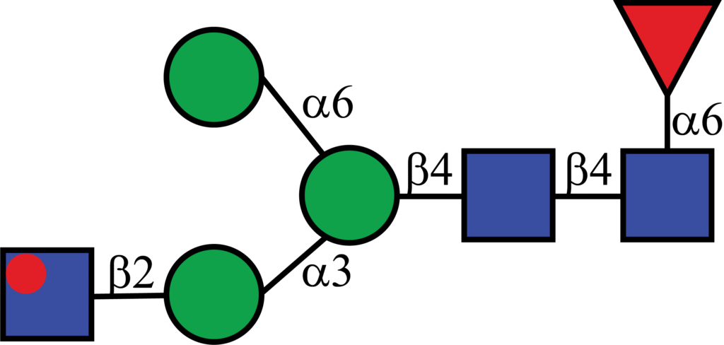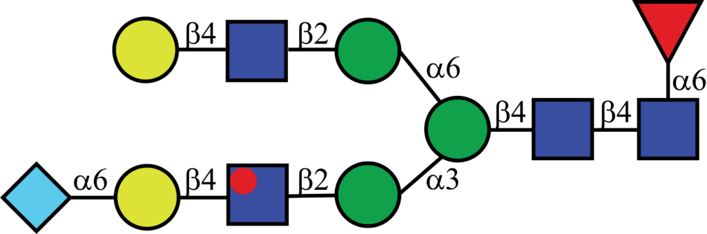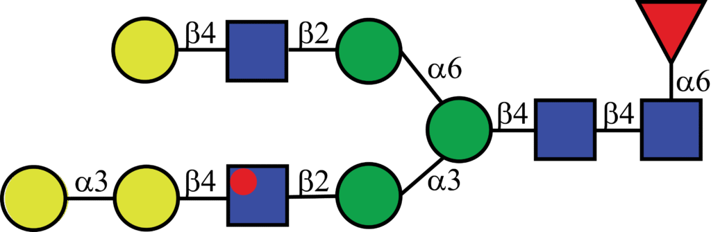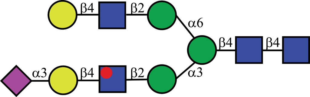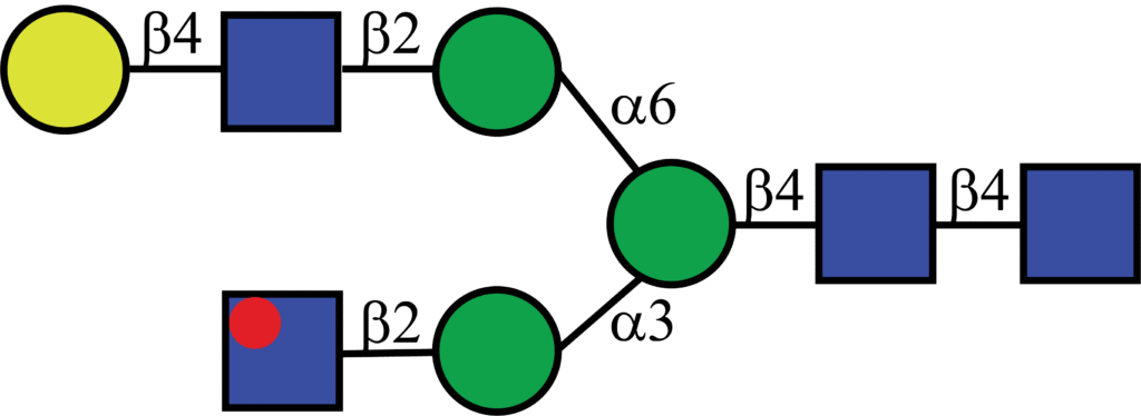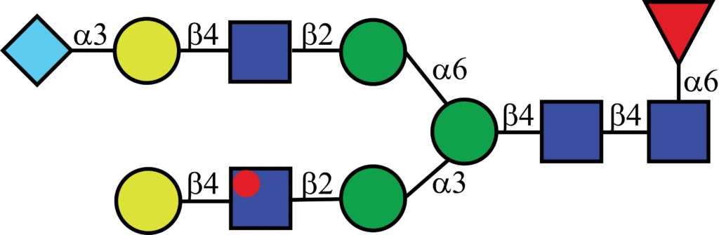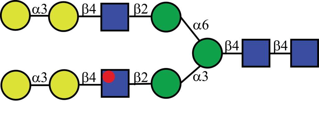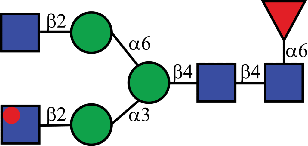 To help overcome the challenges associated with N-glycan structural assignment, a collection of the most abundant N-glycans found in human serum was created. This library comprises structures containing common glyco-epitopes such as α2,3-sialic acid, α2,6-sialic acid, and core fucose. Furthermore, the library members are presented as symmetric and asymmetric architectures.